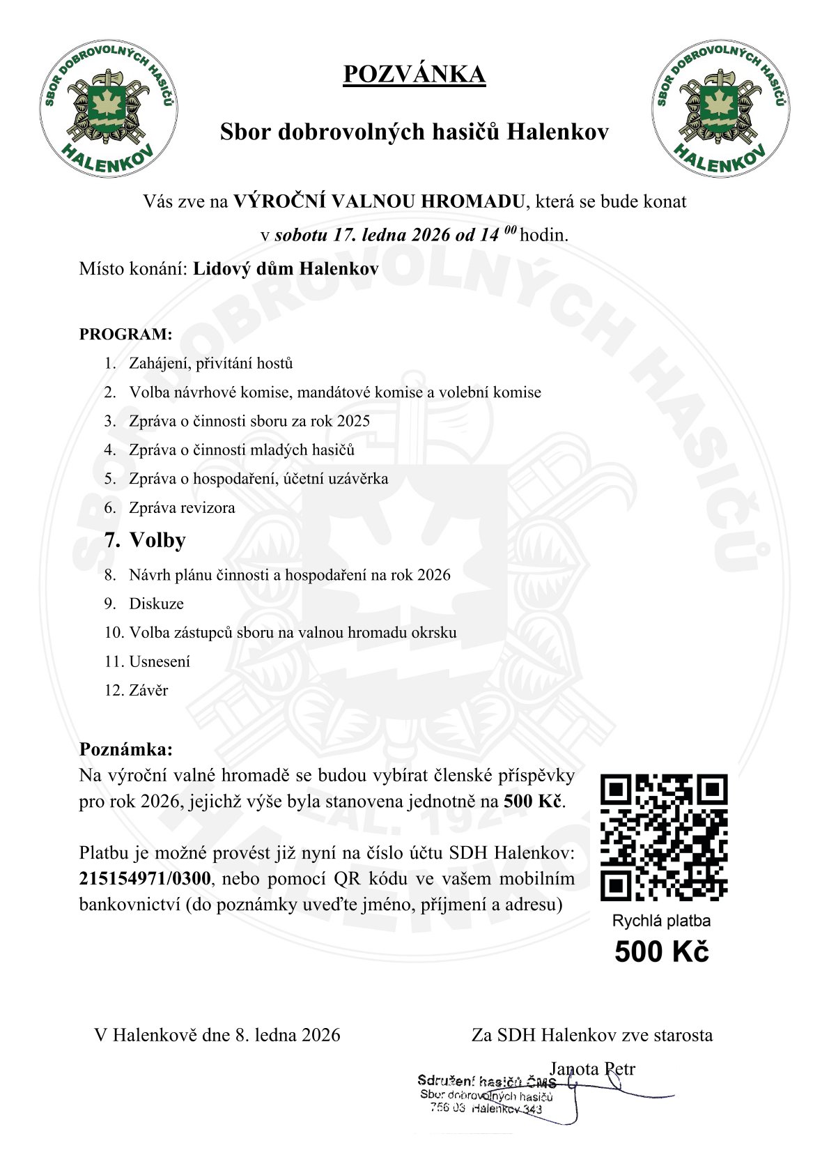 Pozvánka na výroční valnou hromadu SDH Halenkov – 2025